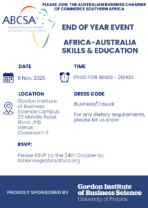 The Australian Business Chamber of Commerce Southern Africa will be hosting an End of Year, Africa-Australia Skills & Education Event on 6 November 2025 from 17h30 – 20h00